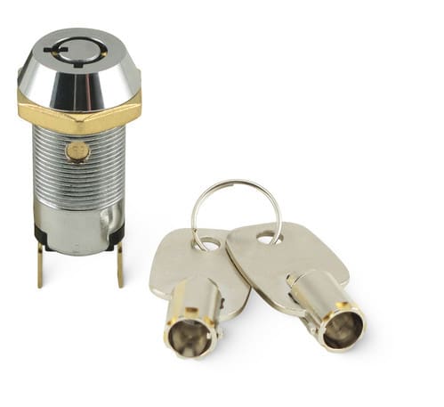 ** Caratteristiche Generali ** Attuatore: Chiave Forma dell'attuatore: Piatto, Rotondo Serigrafia: Nessuna Luminoso: no Materiale attuatore: Ottone nichelato Tipi contatti: SPST N. poli: 1 Stato dei contatti: ON/OFF Tipo terminale: faston 6,3 N. terminali: 2 Montaggio: Pannello con dado Foro fissaggio: ø19mm Dieci diverse combinazioni Chiavi di ricambio non gestite