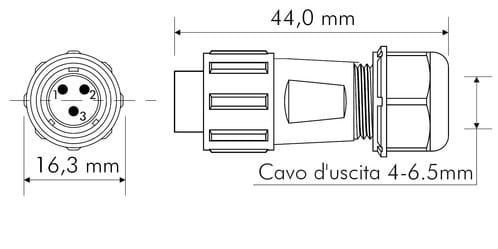 ** Caratteristiche Generali ** Genere: Spina Orientamento: Dritto Nr. Poli: 3 Serie Fornitore: SP11 ** Caratteristiche Elettriche ** Corrente max: 5A Tensione max: 180V ** Caratteristiche Meccaniche ** Materiale Corpo: Nylon Materiale Contatto: Lega dirame dorata Tipo contatto: a saldare Terminazione: a saldare Montaggio connettore: volante Sezione conduttori: 0-0.79mm² Diametro cavo min: 4mm Diametro cavo max: 6.5mm Grado di protezione: IP68 ** Caratteristiche Termiche ** Temperatura di lavoro: -25/80°C