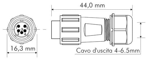** Caratteristiche Generali ** Genere: Spina Orientamento: Dritto Nr. Poli: 5 Serie Fornitore: SP11 ** Caratteristiche Elettriche ** Corrente max: 5A Tensione max: 125V ** Caratteristiche Meccaniche ** Materiale Corpo: Nylon Materiale Contatto: Lega dirame dorata Tipo contatto: a saldare Terminazione: a saldare Montaggio connettore: volante Sezione conduttori: 0-0.79mm² Diametro cavo min: 4mm Diametro cavo max: 6.5mm Grado di protezione: IP68 ** Caratteristiche Termiche ** Temperatura di lavoro: -25/80°C