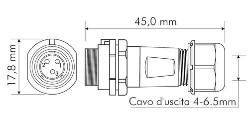 ** Caratteristiche Generali ** Genere: Presa Orientamento: Dritto Nr. Poli: 3 Serie Fornitore: SP11 ** Caratteristiche Elettriche ** Corrente max: 5A Tensione max: 180V ** Caratteristiche Meccaniche ** Materiale Corpo: Nylon Materiale Contatto: Lega dirame dorata Tipo contatto: a saldare Montaggio connettore: volante Sezione conduttori: 0-0.79mm² Diametro cavo min: 4mm Diametro cavo max: 6.5mm Grado di protezione: IP68 ** Caratteristiche Termiche ** Temperatura di lavoro: -25/80°C