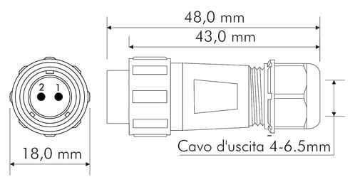 ** Caratteristiche Generali ** Genere: Spina Orientamento: Dritto Nr. Poli: 2 Serie Fornitore: SP13 ** Caratteristiche Elettriche ** Corrente max: 13A Tensione max: 250V ** Caratteristiche Meccaniche ** Materiale Corpo: Nylon Materiale Contatto: Lega di rame dorata Tipo contatto: a saldare Terminazione: a saldare Montaggio connettore: volante Sezione conduttori: 0-2mm² Diametro cavo min: 4mm Diametro cavo max: 6.5mm Grado di protezione: IP68 ** Caratteristiche Termiche ** Temperatura di lavoro: -25/80°C