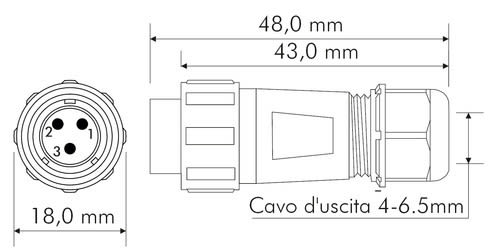 ** Caratteristiche Generali ** Genere: Spina Orientamento: Dritto Nr. Poli: 3 Serie Fornitore: SP13 ** Caratteristiche Elettriche ** Corrente max: 13A Tensione max: 250V ** Caratteristiche Meccaniche ** Materiale Corpo: Nylon Materiale Contatto: Lega di rame dorata Tipo contatto: a saldare Montaggio connettore: volante Sezione conduttori: 0-2mm² Diametro cavo min: 4mm Diametro cavo max: 6.5mm Grado di protezione: IP68 ** Caratteristiche Termiche ** Temperatura di lavoro: -25/80°C