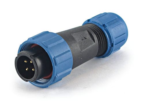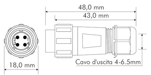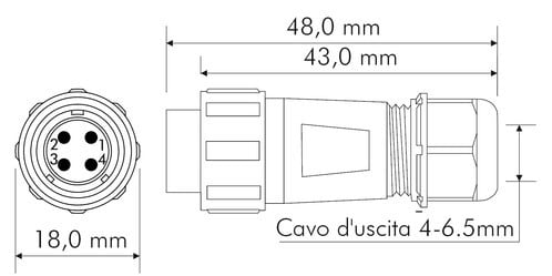 ** Caratteristiche Generali ** Genere: Spina Orientamento: Dritto Nr. Poli: 4 Serie Fornitore: SP13 ** Caratteristiche Elettriche ** Corrente max: 5A Tensione max: 200V ** Caratteristiche Meccaniche ** Materiale Corpo: Nylon Materiale Contatto: Lega dirame dorata Tipo contatto: a saldare Terminazione: a saldare Montaggio connettore: volante Sezione conduttori: 2mm² Diametro cavo min: 4mm Diametro cavo max: 6.5mm Grado di protezione: IP68 ** Caratteristiche Termiche ** Temperatura di lavoro: -25/80°C