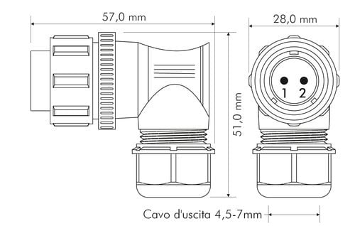 ** Caratteristiche Generali ** Genere: Spina Orientamento: 90° Nr. Poli: 2 Serie Fornitore: SP21 ** Caratteristiche Elettriche ** Corrente max: 30A Tensione max: 500V ** Caratteristiche Meccaniche ** Materiale Corpo: Nylon Materiale Contatto: Lega di rame dorata Tipo contatto: a saldare Montaggio connettore: volante Sezione conduttori: 0-4mm² Diametro cavo min: 4.5mm Diametro cavo max: 7mm Grado di protezione: IP68 ** Caratteristiche Termiche ** Temperatura di lavoro: -25/80°C