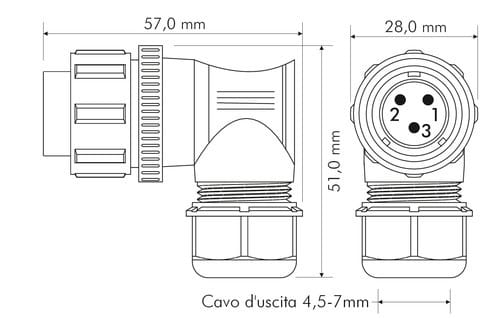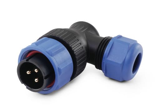 ** Caratteristiche Generali ** Genere: Spina Orientamento: 90° Nr. Poli: 3 Serie Fornitore: SP21 ** Caratteristiche Elettriche ** Corrente max: 30A Tensione max: 500V ** Caratteristiche Meccaniche ** Materiale Corpo: Nylon Materiale Contatto: Lega di rame dorata Tipo contatto: a saldare Montaggio connettore: volante Sezione conduttori: 0-4mm² Diametro cavo min: 4.5mm Diametro cavo max: 7mm Grado di protezione: IP68 ** Caratteristiche Termiche ** Temperatura di lavoro: -25/80°C
