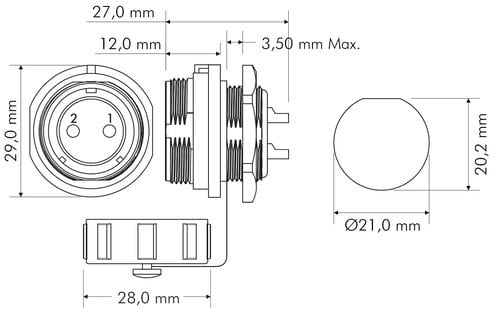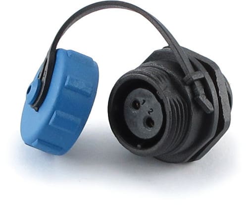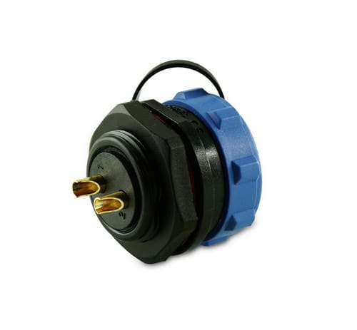 ** Caratteristiche Generali ** Genere: Presa Orientamento: Dritto Nr. Poli: 2 Serie Fornitore: SP21 ** Caratteristiche Elettriche ** Corrente max: 30A Tensione max: 500V ** Caratteristiche Meccaniche ** Materiale Corpo: Nylon Materiale Contatto: Lega di rame dorata Tipo contatto: a saldare Montaggio connettore: pannello Sezione conduttori: 0-4mm² Grado di protezione: IP68 ** Caratteristiche Termiche ** Temperatura di lavoro: -25/80°C