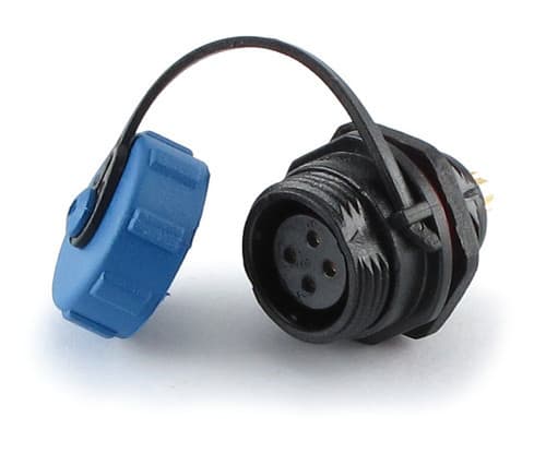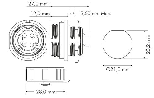 ** Caratteristiche Generali ** Genere: Presa Orientamento: Dritto Nr. Poli: 4 Serie Fornitore: SP21 ** Caratteristiche Elettriche ** Corrente max: 30A Tensione max: 500V ** Caratteristiche Meccaniche ** Materiale Corpo: Nylon Materiale Contatto: Lega di rame dorata Tipo contatto: a saldare Montaggio connettore: pannello Sezione conduttori: 0-4mm² Grado di protezione: IP68 ** Caratteristiche Termiche ** Temperatura di lavoro: -25/80°C