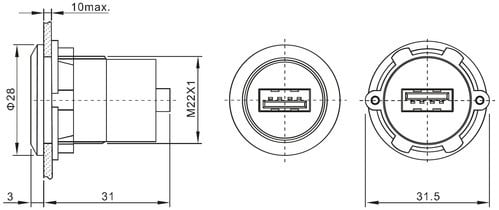 Fissaggio: a pannello Spessore pannello: 1-8mm Diametro foro: ø22mm ** Caratteristiche Generali ** Genere: Presa Colore: Nero Orientamento: Dritto Tipo Connettore A: USB tipo A Genere A: Presa Tipo Connettore A: Presa USB tipo A ø31.5mm Tipo Connettore B: USB tipo A Genere B: Presa Tipo Connettore B: Presa USB tipo A ø22mm ** Caratteristiche Meccaniche ** Materiale Corpo: Plastico La presa viene definita IP65 esclusivamente installando la cover opzionale "P-CAPN". In caso di mancata installazione di tale cover il grado di protezione è IP20.