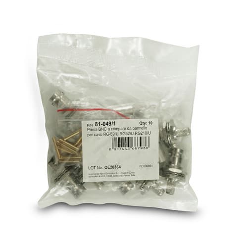 ** Caratteristiche Generali ** Genere: Presa Tipo Connettore: BNC Orientamento: Dritto Adatto per cavo RG: RG-59/U RG62/U RG210/U ** Caratteristiche Elettriche ** Impedenza: 75ohm ** Caratteristiche Meccaniche ** Materiale Corpo: Ottone nichelato Tipo contatto: a saldare o crimpare Terminazione: a crimpare Montaggio connettore: pannello
