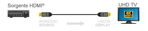 ** Caratteristiche ** Interfaccia: HDMI® Tipologia: HDMI® High Speed with Ethernet Risoluzione massima: 2160p (4K@60fps) Standard supportati: ARC, CEC, HDR Profondità colore: 16 bit/canale Compatibile 3D: si Versione HDCP: 2.2 Velocità: 18Gbps Colore cavo: Grigio Lunghezza Cavo: 30m Diametro cavo: ø5mm Tipo Cavo: Fibra ottica Applicazione CPR: Posa mobile Tecnologia: Attivo Guaina cavo: PVC Corpo connettori: Metallico Finitura contatto : Dorato ** Connettore A ** Tipo Connettore A: Spina HDMI® 19 poliDritto ** Connettore B ** Tipo Connettore B: Spina HDMI® 19 poli Dritto Attenzione: verso di collegamento indicato sul connettore.