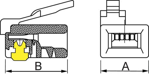 ** Caratteristiche Generali ** Genere: Spina Categoria: CAT.3 Colore: Trasparente Nr. Poli: 4 Configurazione Poli: 6P4C Adatto per tipo conduttore: Trefolo Sezione AWG: AWG24-26 Tipo Clip: DEC/Digitale ** Caratteristiche Elettriche ** Corrente max: 1.5A Schermatura: no ** Caratteristiche Meccaniche ** Materiale Corpo: PC UL 94V-2 Materiale Contatto: Bronzo fosforoso Placcatura contatti: Contatti dorati Inserti: 0 Placcatura: 3µm Formato Corpo: Standard Dim. A: 9.6mm Dim. B: 12.32mm