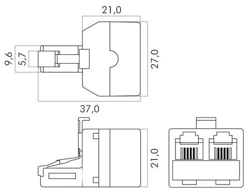 ** Caratteristiche Generali ** Genere: Adattatore Tipo Connettore A: Modulare 6P4C Genere A: Spina Tipo Connettore A: Spina Modulare 6P4C Tipo Connettore B: Modulare 6P4C Genere B: Presa Tipo Connettore B: 2x Presa Modulare 6P4C ** Caratteristiche Meccaniche ** Materiale Corpo: Policarbonato Materiale Contatto: Bronzo fosforoso