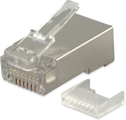 ** Caratteristiche Generali ** Genere: Spina Categoria: CAT.5e Colore: Trasparente Nr. Poli: 8 Configurazione Poli: 8P8C Adatto per tipo conduttore: Rigido Sezione AWG: AWG24-26 Tipo Clip: Standard ** Caratteristiche Elettriche ** Schermatura: si Tipo Schermatura: U/FTP ** Caratteristiche Meccaniche ** Materiale Corpo: PC UL 94V-2 Materiale Contatto: Bronzo fosforoso Placcatura contatti: Contatti dorati Diametro cavo max: 5.5mm Inserti: 1 Placcatura: 50µm Formato Corpo: Standard Dim. A: 11.68mm Dim. B:21.48mm ** Caratteristiche Termiche ** Classe di infiammabilità: UL94V-2