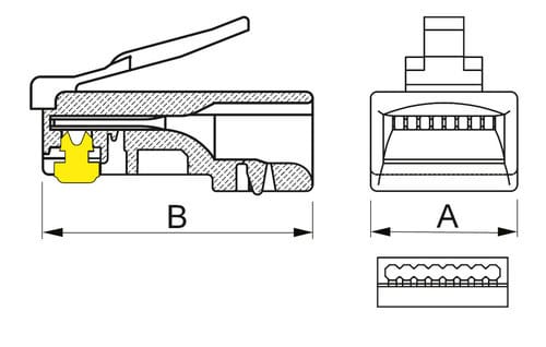 ** Caratteristiche Generali ** Genere: Spina Categoria: CAT.5e Colore: Trasparente Nr. Poli: 8 Configurazione Poli: 8P8C Adatto per tipo conduttore: Trefolo + Rigido Sezione AWG: AWG24-26 Tipo Clip: Standard ** Caratteristiche Elettriche ** Schermatura:no ** Caratteristiche Meccaniche ** Materiale Corpo: PC UL 94V-2 Materiale Contatto: Bronzo fosforoso Placcatura contatti: Contatti dorati Tipo contatto: 2-prong Diametro conduttori max: 1mm Diametro cavo max: 6mm Inserti: 0 Placcatura: 50µm Formato Corpo: Standard Dim. A: 11.68mm Dim. B: 21.48mm ** Caratteristiche Termiche ** Classe di infiammabilità: UL94V-2