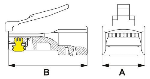 ** Caratteristiche Generali ** Genere: Spina Categoria: CAT.5e Colore: Trasparente Orientamento: Dritto Nr. Poli: 8 Configurazione Poli: 8P8C Adatto per tipo conduttore: Trefolo + Rigido Sezione AWG: AWG24-26 Tipo Clip: Standard ** Caratteristiche Elettriche ** Schermatura: no ** Caratteristiche Meccaniche ** Materiale Corpo: PC UL 94V-2 Materiale Contatto: Bronzo fosforoso Placcatura contatti: Contatti dorati Tipo contatto: 3-prong Terminazione: a crimpare Montaggio connettore: volante Diametro conduttori max: 1mm Diametro cavo max: 5.5mm Inserti: 0 Placcatura: 50µm Formato Corpo: Standard Dim. A: 11.68mm Dim. B: 21.48mm ** Caratteristiche Termiche ** Classe di infiammabilità: UL94V-2