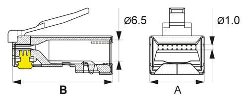 ** Caratteristiche Generali ** Genere: Spina Categoria: CAT.6 Colore: Trasparente Nr. Poli: 8 Configurazione Poli: 8P8C Adatto per tipo conduttore: Trefolo + Rigido Sezione AWG: AWG24-26 Tipo Clip: Standard ** Caratteristiche Elettriche ** Schermatura: si ** Caratteristiche Meccaniche ** Materiale Corpo: PC UL 94V-2 Materiale Contatto: Bronzo fosforoso Placcatura contatti: Contatti dorati Tipo contatto: 3-prong Diametro conduttori max: 1mm Diametro cavo max: 6mm Inserti: 0 Placcatura: 50µm Formato Corpo: Standard Dim. A: 11.68mm Dim. B: 21.48mm ** Caratteristiche Termiche ** Classe di infiammabilità: UL94V-2