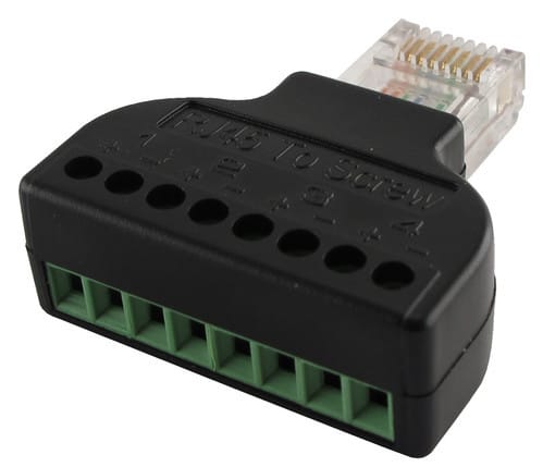 ** Caratteristiche Generali ** Genere: Spina Colore: Nero Tipo Connettore A: RJ45 Genere A: Spina Tipo Connettore A: Spina RJ45 Tipo Connettore B: Morsetto a vite Tipo Connettore B: Morsetto a vite 8 poli ** Caratteristiche Meccaniche ** Materiale Corpo: PVC Materiale Contatto: Ottone nichelato