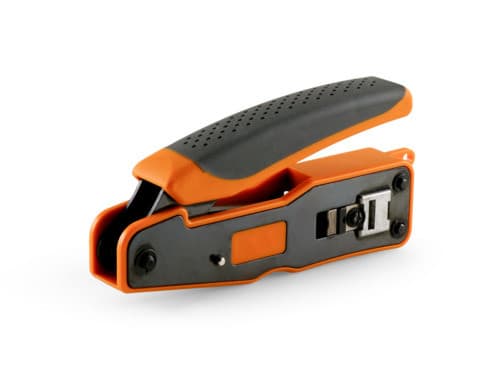 La pinza professionale 98-157 sviluppata per i connettori Cat.5e UTP, Cat.6 UTP, Cat.6 FTP, Cat.6a UTP e Cat.6a FTP in tecnologia passante crimpa la terminazione e allo stesso tempo taglia i cavi a zero. La pinza è compatibile anche con i connettori RJ45 tradizionali.