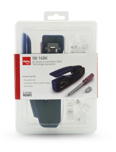 Kit valigetta per crimpatura connettori RJ45 passanti. La pratica valigetta contiene tutto il necessario per semplificare la crimpatura dei connettori RJ45 per reti LAN. La pinza è compatibile anche con i connettori RJ45 tradizionali. ** Contenuto confezione ** 98-168: pinza RJ45 15pz spine RJ45 Cat.5e UTP Cacciavite ** Caratteristiche Generali ** Funzione: Crimpatura Adatta per connettori: RJ45 8P8C Chiusura: a cricchetto Inserto: fisso Materiale corpo: Acciaio Materiale impugnatura: PVC Forma impugnatura: Antiscivolo ed ergonomica