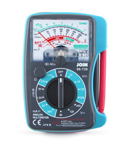 Multimetro portatile analogico compatto e robusto che unisce la tecnica di misurazione analogica tradizionale a un equipaggiamento moderno. Gli ingressi sono protetti contro i sovraccarichi. Il multimetro ha sei gamme di misurazione: Tensione (CC), Corrente (CC), Tensione (CA), Corrente (CA), Resistenza, Decibel, Prova batteria (1,5V e 9V). ** Caratteristiche Generali ** Tipo di misuratore: Multimetro analogico Grandezze misurabili: Tensione AC, Tensione DC, Resistenza, Corrente DC, Prova batterie Indicazione: Scala graduata Protezioni: Sovraccarico Data Hold: No Memoria: No Interfaccia PC: No Software/firmware aggiornabile: No Funzione autodiagnosi: No Spegnimento automatico: No Adatto per: Batterie, Resistenze Connessioni: Puntali Funzioni aggiuntive:Tascabile Accessori inclusi: Puntali ** Caratteristiche Elettriche ** Livello sicurezza: Cat III Tipo batterie: 1xAAA Batterie incluse: No ** Caratteristiche Meccaniche ** Grado di protezione: IP20 Dimensioni: 28mm x 85mm x 119mm Temperatura di lavoro:0 / 40°C Temperatura di stoccaggio: 0 / 50°C Umidità atmosferica relativa: