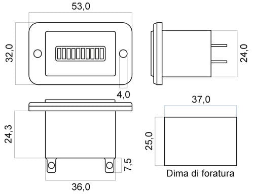 ** Caratteristiche ** Indicatore della tensione di batteria con display bar graph a dieci segmenti led. ** Dati tecnici ** Tensione operativa: 12/24V con interruttore Auto consumo: 20mA ** Parametri misurati: ** Tensione: 12/24V con alimentazione da batteria ** Display ** Display 3 colori (1 rosso, 2 gialli e 7 verdi Dima di foratura: 37x25mm ** Caratteristiche Generali ** Grado Protezione: IP65 ** Caratteristiche Elettriche ** Tensione d'ingresso: 12‑24Vdc ** Caratteristiche Meccaniche ** Dimensioni (LxWxH): 32 x 53 x 31.9mm Materiale contenitore: Plastico Colore: Nero Connessioni: faston 4,8 ** Caratteristiche Termiche ** Temperatura di lavoro: -10/40°C