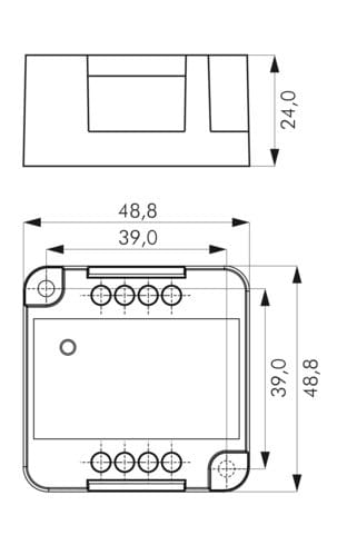 ** Caratteristiche generali ** Dimmer monocolore per strisce led e sorgenti led resistive a tensione costante 12V oppure 24V. Il controllo dell’intensità luminosa viene eseguito tramite pulsante generico opportunamente installato ai morsetti PP. Pulsantenon fornito. Il dispositivo mantiene memoria dell'ultimo modo di funzionamento impostato anche dopo aver spento e riacceso l'alimentazione. ** Tipologia controllo ** Comando: pulsante N.O. Modalità di controllo pulsante ** Funzionamento ** - Click: acceso/spento. - Pressione a lungo da acceso: aumento/diminuzione intensità. Luminosità minima: 2,5% (non modificabile). - Pressione a lungo da spento: accensione modalità “luce di cortesia” (Default 10%). Questa intensità è modificabile (impostando un valoretra 2,5% e il 10%). ** Protezioni ** Sovratemperatura, Inversione di polarità Sovraccarico Cortocircuito in uscita Sovra-alimentazione Sotto-alimentazione ** Caratteristiche Generali ** Funzione: Controller Adatto per: Monocolore Metodo di controllo: Pulsante ** Caratteristiche Elettriche ** Tipo regolazione: Tensione costante (CV) Tensione d'ingresso: 12/24V Tensione d'uscita: come ingresso Tipo di uscita: morsetti Metodo di connessione: anodo comune Corrente/Ch: 10A n. canali: 1 Potenza nominale (12V): 120W Potenza nominale (24V): 240W ** Caratteristiche Meccaniche ** Lunghezza: 48.8mm Larghezza: 48.8mm Altezza: 24mm Grado di protezione: IP20 Materiale corpo: Plastica Colore corpo: Bianco ** Caratteristiche Termiche ** Temp. di funzionamento: -10 / 40°C ** Note ** L’installazione deve essere eseguita solamente da personale qualificato. Il prodotto deve essere installato all’interno di un quadro elettrico. Installare un fusibile adeguato in ingresso al dispositivo. L’alimentatore dovrà essere scelto in funzione del carico led collegato per tensione e corrente. Utilizzare un alimentatore con potenza nominale maggiore rispetto al carico da alimentare (circa 30%).
