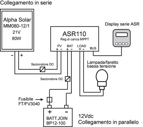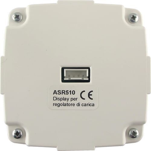 Il display ASR510 Alpha Solar consente di gestire in remoto i regolatori di carica della serie ASR110, ASR120 e ASR130, di monitorare lo stato del sistema fotovoltaico e di controllare l’accensione e lo spegnimento del carico per una distanza massima di 100 metri tramite cavo (cavo incluso da 1mt). ** Caratteristiche generali ** Visualizzazione dati del sistema fotovoltaico Visualizzazione energia di carica e scarica del singolo giorno. Tensione di alimentazione: 12-24Vdc (ASR510) Linee display: 8x2 Comunicazione: protocollo Modbus RTU Lunghezza collegamento 100m max Menù dati visualizzati: - Tensione batteria - Tensione pannello - Corrente di carica dal pannello - Corrente di uscita verso il carico - Temperatura regolatore - Temperatura batteria - Energia di carica del giorno - Energia di scarica del giorno Funzioni controllo remoto: - On-off del carico