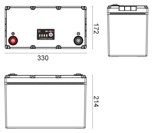 ** Caratteristiche Generali ** Tecnologia: LiFePO4 Caratteristiche aggiuntive: con riscaldatore integrato Cicli di vita: 3500 ** Caratteristiche Elettriche ** Tensione: 12.8V Capacità: 100Ah Energia: 12800KWh Corrente di carica massima: 100A Corrente dicarica raccomandata: 50A Tensione di carica stand-by: 14.6V Corrente di scarica massima: 100A Tensione di fine scarica: 11.2V Connessione parallelo: 2 Connessione serie: 4 Protezioni: Corto circuito, Scarica eccessiva, Sovratemperatura ** Caratteristiche Meccaniche ** Dimensioni: 330mm x 172mm x 214mm Peso: 10.5Kg Grado di protezione: IP65 Connessioni: a vite M8 Materiale contenitore: ABS Temperatura di lavoro: 0 / 50°C Umidità: 0 / 95%