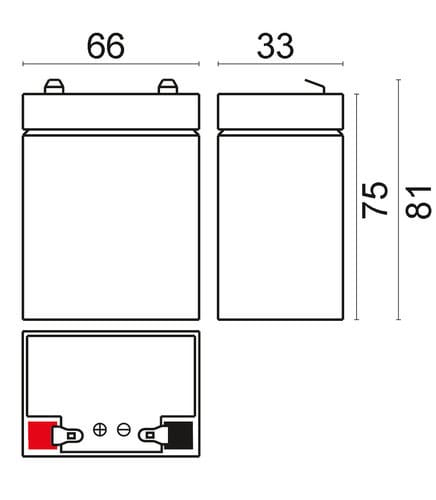 ** Caratteristiche Generali ** Tecnologia: Piombo AGM ** Caratteristiche Elettriche ** Tensione: 4V Capacità: 3Ah ** Caratteristiche Meccaniche ** Dimensioni: 66mm x 33mm x 75mm Peso: 0.33Kg Connessioni: faston 4.8mm