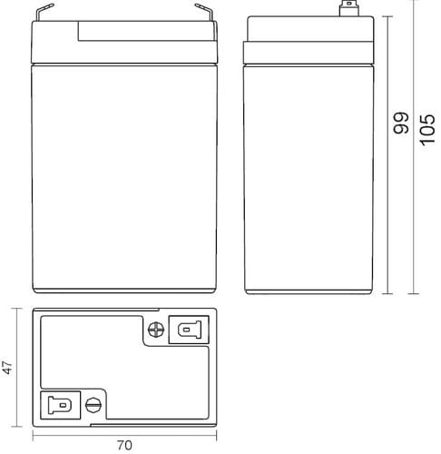 ** Caratteristiche Generali ** Adatto per: UPS Tecnologia: Piombo AGM ** Caratteristiche Elettriche ** Tensione: 6V Capacità: 4.5Ah ** Caratteristiche Meccaniche ** Dimensioni: 47mm x 70mm x 105mm Peso: 0.71Kg Connessioni: faston 4.8mm