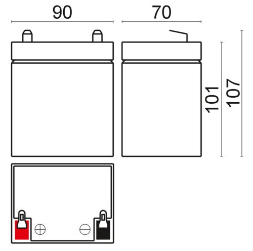 ** Caratteristiche Generali ** Adatto per: UPS Tecnologia: Piombo AGM ** Caratteristiche Elettriche ** Tensione: 12V Capacità: 5.5Ah Potenza (15min 1,67V/cella 25°C): 22W Corrente di scarica massima: 55A ** Caratteristiche Meccaniche ** Dimensioni: 90mm x 70mm x 101mm Peso: 1.55Kg ± 5% Connessioni: faston 6.3mm Materiale contenitore: UL94 V0 Temperatura di immagazzinamento: -20 / 60°C Temperatura di lavoro: 0 / 50°C