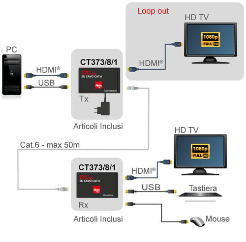 L'extender CT373/8/1 è un dispositivo in grado di estendere la lunghezza dei cavi HDMI utilizzando un singolo cavo Cat.6 e include una unità trasmettitore (Tx) e una unità ricevitore (Rx). E' possibile collegare al trasmettitore(Tx) un PC tramite cavo USB e collegare al ricevitore(Rx) due diverse periferiche (mouse e tastiera per esempio) sempre tramite cavo USB che comunicano direttamente con il PC. ** Specifiche ** - Coppia di moduli plug-and-play, TX + RX - Estensione su singolo cavo CAT.6 IEEE-568B - Installazione plug and play, nessun driver o software richiesto - Risoluzioni supportate: 480i@60Hz, 480p@60Hz, 576i@60Hz, 576p@60Hz, 720p@50/60Hz, 1080i@50/60Hz, 1080p@30Hz, 1080p@50/60Hz - Distanza di trasmissione del segnale: - max 50m (utilizzandocavo Cat.5e/6 AWG24). ** Caratteristiche ** Tipologia: Trasmettitore+Ricevitore Tecnologia trasmissione: Standard 1xCat. 5e/6 Tipo Extender: HDMI® Distanza Extender: 50m Compatibile 3D: no Compatibile 4K: no Topologia collegamento: 1:1 Profondità colore: 8bit/canale Funzioni aggiuntive: USB, PoC, Loop-Out ** Installazione ** Montaggio: Desktop ** Specifiche HDMI ** - Blu-ray e HD DVD in Full HD (1080p) - Larghezza di banda fino a 10.2Gbps totali ** Connessioni ** Trasmettitore - Connettore HDMI (Ingresso) - Connettore USB - Connettore RJ45 Ricevitore - Connettore HDMI (Uscita) - Connettore RJ45 - 2 connettori USB Dimensioni: 109x76,5x25,4mm ** Contenuto confezione ** 1x Trasmettitore 1x Ricevitore 1x Alimentatore 12Vdc 1A 1x Cavo USB da spina "tipoA" a spina "tipo B"