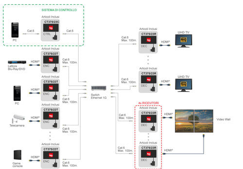 Extender HDMI Over IP costituito da un modulo trasmettitore (DEC) e un modulo ricevitore (ENC) adatto per estendere le distanze di trasmissione dei cavi HDMI tradizionali utilizzando cavi ethernet UTP/STP Cat.6 in rame. E' possibile collegare, tramite switch di rete Gigabit, trasmettitori (CT375/23T) e ricevitori (CT375/23R) aggiuntivi da ordinare separatamente. Questo extender HDMI consente di inviare un segnale 1080p FullHD tramite una rete LAN pre-esistente basata su switch 100M/1G. Elevata qualità video, bassa larghezza di banda e compressione H.265/H.264 configurabili da parte dell'utente. Questi dispositivi possono funzionare in due modalità: come extender punto a punto collegando un trasmettitore e ricevitore direttamente (Soluzione 1:1), oppure come sistema di distribuzione punto a multi-punto cioè da un trasmettitore a più ricevitori (Soluzione 1:N). Nella connessione 1:N è possibile collegare un numero illimitato di ricevitori.* Supporta la funzione USB/KVM, il controllo bidirezionale IR/RS-232 (passthrough & Guest mode) e controllo macchina singola (senza Controller Box, la commutazione a matrice può essere realizzata con pulsanti del pannello, controllo IR locale o RS-232). *NOTA: il numero massimo di ricevitori dipende dal numero di porte dello switch. ** Caratteristiche ** Tipologia: Ricevitore Tecnologia trasmissione: Over IP (LAN) Tipo Extender: HDMI® Distanza Extender: 100m Compatibile 3D: no Compatibile 4K: no Topologia collegamento: N:N Profondità colore: 12bit/canale Funzioni aggiuntive: IR, RS232, USB ** Specifiche HDMI ** - Conforme a HDMI 1.3 e HDCP 1.4 - Risoluzione video fino a 1920x1200@60Hz 4:4:4 - Supporta larghezza di banda video di 4,95 Gbps - La distanza di trasmissione del segnale può essere estesa fino a 100 m tramite cavo CAT.6/6A/7 - Supporta l'estensione del segnale point-to-point - Supporta le funzioni di distribuzione del segnale, modalità multicast, matrice distribuita e video wall (fino a 9 x 9) su uno switch di rete 1G - La gestione intelligente del video wall rende possibili layout innovativi - Supporta il formato audio LPCM 2.0CH (32/44.1/48KHz). - L'encoder supporta il loop out locale HDMI - Supporta l'incorporamento e l'estrazione dell'audio - Supporta la funzione USB/KVM (uno a uno e uno a molti) e il controllo bidirezionale IR/RS-232 (modalità pass-through e guest) - Supporta le modalità di codifica del flusso principale e del flusso secondario - I parametri di flusso possono essere configurati tramite Web GUI o Controller Box - Controllato tramite pulsanti del pannello, IR, RS-232, TCP/IP, Web GUI e Controller Box - Supporta la funzione POE (802.3af Classe 3, modalità PD) ** Contenuto confezione ** 1x Decoder 2K60 su IP 100M/1GbE 2x Connettore Phoenix a 3 pin (3,81 mm, maschio) 1x Cavo IR Blaster (1,5 metri) 1x Cavo ricevitore IR (1,5 metri) 4x Viti di montaggio (KM3, 4 mm) 2x Staffe di montaggio 1x Alimentatore 12Vdc 1A