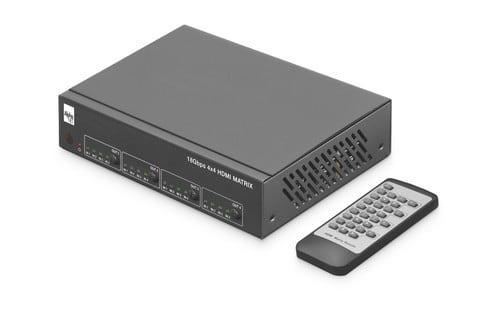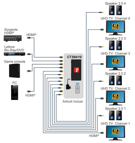 La matrice HDMI® CT384/10 permette la connessione di 4 sorgenti HDMI® a 4 uscite video come TV o monitor permettendo la scelta di qualunque ingresso per ogni uscita. La selezione della combinazione di collegamento tra ingressi e uscite può essere effettuata tramite tasti, tramite il telecomando fornito in dotazione, tramite controllo TCP/IP o tramite seriale RS-232. ** ATTENZIONE ** : la matrice è dotata di funzione scaler permette quindi la riduzione automatica della risoluzione da 4K a 1080p. ** Specifiche ** - Funzione scaler da 4K a 1080p - Supporto HDR, HDR10, HDR10+, Dolby Vision, HLG - Dimensioni 220x105x44mm - Peso 720g - Consumo 10W max ** Specifiche HDMI® ** - Conforme HDCP 2.2 - 4K@60Hz YUV 4:4:4 - Spazio colore RGB, YCbCr, xvYCC - SupportoAudio PCM2.0ch, PCM5.1ch, PCM7.1ch, DolbyDigital/Plus/EX, Dolby TrueHD, DTS, DTS-EX, DTS-96/24, DTS High RES, DTS-HD Master Audio, DSD ** Caratteristiche ** Ingresso: 4 HDMI® Uscita: 4 HDMI®|Audio COAX|Audio L/R Compatibile 3D: si Compatibile 4K: si Profondità colore: 12bit/canale Risoluzione massima: 4Kx2K@60Hz Funzioni aggiuntive: IR, HDR, ARC, Scaler, LAN, RS232 ** Contenuto confezione ** 1x Matrice HDMI® 1x Telecomando IR 1x Alimentatore 12Vdc 2,5A 1x Staffe di montaggio 1x Cavo ricevitore IR ** Down scaling: ** Solo il formato video HDMI® 4K@30/50/60Hz (spazio colore YUV 4:4:4 oppure 4:2:0) può essere scalato a 1080p@30/50/60Hz. Lo scaler non supporta il down scaling di segnali con spazio colore RGB. ** Nota: ** in modalità SCALER, la matrice non permette la gestione dell’HDR. La matrice trasferisce in uscita l'HDR solo a patto che tutte le TV connesse siano 4K e che entrambe supportino l'HDR. Attenzione: spesso l'HDR deve essere abilitato nel menù di configurazione della TV.