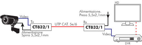 Il balun passivo CT832/1 è un convertitore per la trasmisione del segnale video e dell'alimentazione su cavo twistato Cat5 o superiore per applicazioni TVCC. L'utilizzo di due dispositivi (trasmettitore e ricevitore) consente la trasmissione del segnale video e dell'alimentazione senza necessità di alimentazione esterna del convertitore stesso. Esso dispone da un lato di un cavetto con connettore BNC e di un cavetto con connettore di alimentazione DC (5,5x2,1mm) per il collegamento del dispositivo video (telecamera e monitor) e dall'altro di un connettore RJ45 per il cavo Cat5. Una coppia viene utilizzata per il segnale video e tre coppie per la tensione di alimentazione. Per la corretta installazione del prodotto, collegare, il dispositivo con la spina DC al trasmettitore (lato telecamera) e il dispositivo con la presa DC al ricevitore (DVR). ** Caratteristiche elettriche ** Adatto per: Telecamere CCTV, Monitor, DVR Formato Video: PAL, NTSC, SECAM, AHD, HD-CVI, HD-TVI Distanza trasmissione: vedi tabella Cavo consigliato: UTP Cat5 o superiore 24-22AWG Trasmissione alimentazione: max 24Vac/dc Distanza alimentazione: in base alla caduta sul cavo Cat5 Alimentazione: Non richiesta Reiezione modo comune/modo differenziale: 60dB typ (15KHz-42MHz) Impedenza: Coassiale 75ohm, UTP 100ohm Attenuazione: 1.5 dB typ Max ** Connettori ** Video: BNC maschio Power: Spina e Presa 5,5x2,1mm Cavo Cat5: RJ45 ** Protezioni ** Sovratensione: Stato solido TVS (Transient Voltage Suppressor) Video Input: 2KV (modo comune) Video Output: 2KV (modo differenziale) ** Caratteristiche meccaniche ** Corpo: plastico Protezione: IP20 Colore: Nero Dimensioni(LxWxH): 65x36x25mm Temperatura di lavoro: -10º ~ 40ºC Attenzione: Non utilizzare in ambienti esterni.