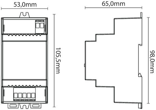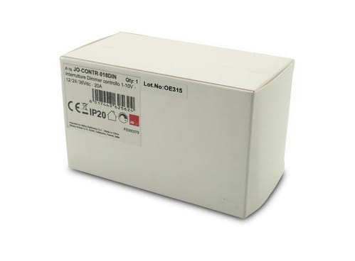 ** Caratteristiche ** Dimmer 1-10V per barra DIN attraverso il quale è possibile controllare l'accensione automatica e la regolazione di intensità di nastri led, lampade e faretti funzionanti a tensione costante (12, 24 oppure 36Vdc). Funzionamento: E' possibile controllare l'accensione on-off grazie all'ingresso 1-10V. - contatto chiuso --> uscita spenta - contatto aperto --> uscita accesa (intensità 100%) E' possibile regolare l'intensità dell'uscita in modo graduale fornendo all'ingresso 1-10V una tensione da 0 a 10V oppure tramite potenziometro con valore di 470kOhm. L'ingresso è dotato di resistenza di pull-up pari a 30 kOhm. - input 0-1V --> uscita spenta - input 1-10V --> uscita regolata in modo proporzionale - input 10V --> uscita accesa (intensità 100%) Attenzione: non superare la tensione di 10V in ingresso. ** Caratteristiche Generali ** Funzione: Controller Adatto per: Monocolore Metodo di controllo: 1-10V ** Caratteristiche Elettriche ** Tipo regolazione: Tensione costante (CV) Tensione d'ingresso: 12/24/36V Tensione d'uscita: come ingresso Tipo di uscita: morsetti Metodo di connessione: anodo comune Corrente/Ch: 5A n. canali: 4 Potenza nominale (12V): 240W Potenza nominale (24V): 480W ** Caratteristiche Meccaniche ** Lunghezza: 105.5mm Larghezza: 53mm Altezza: 65mm Grado di protezione: IP20 Materiale corpo: Plastica Colore corpo: Grigio ** Caratteristiche Termiche ** Temp. di funzionamento: -10 / 40°C ** Note ** - L'alimentatore dovrà essere scelto in funzione del tipo di carico led utilizzato per tensione e corrente. - Utilizzare un alimentatore con potenza nominale maggiore rispetto al carico led da alimentare (circa 30%).