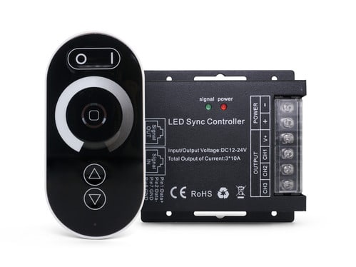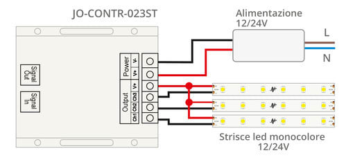 ** Caratteristiche ** Centralina di controllo per sorgenti luminose a led monocromatiche. L'apposito telecomando RF consente il controllo dell'intensità luminosa oltre che il controllo on/off. Inoltre il dispositivo mantiene memoria dell'ultimo modo di funzionamento impostato anche dopo aver spento e riacceso l'alimentazione. Più controller possono lavorare tra di loro simultaneamente se connessi tramite un cavo RJ45. ** Caratteristiche Generali ** Funzione: Controller Adatto per: Monocolore Metodo di controllo: RF ** Caratteristiche Elettriche ** Tipo regolazione: Tensione costante (CV) Tensione d'ingresso: 12/24V Tensione d'uscita: come ingresso Tipo di uscita: morsetti Metodo di connessione: anodo comune Corrente/Ch: 10A n. canali: 3 Potenza nominale (12V): 360W Potenza nominale (24V): 720W ** Caratteristiche Meccaniche ** Lunghezza: 91mm Larghezza: 90mm Altezza: 24mm Grado di protezione: IP20 Materiale corpo: Alluminio verniciato Colore corpo: Nero ** Caratteristiche Termiche ** Temp. di funzionamento: -10 / 40°C ** Note ** - I controller della serie Sync Tecnology sono ricevitori universali se non programmati. Questo significa che tutti i ricevitori sono controllabili da qualsiasi telecomando della stessa serie. Per sincronizzarli in modo ottimale possiamo sfruttare la tecnologia SyncTecnology collegando i ricevitori tramite un cavo Cat.5e o Cat.6 utilizzano le porte RJ45 presenti sul dispositivo. Il controller che decidiamo essere il principale dovrà essere collegato alla porta SignalOUT mentre i controller che decidiamo essere slave andranno connessi alla porta SignaIN. Una volta collegati in questo modo i controller slave si comportano da amplificatori e saranno perfettamente sincronizzati. E' possibile abbinare il controller-ricevitore a un telecomando tramite una procedura specifica e ti invitiamo a seguire il video dedicato per vedere come fare. - L'alimentatore dovrà essere scelto in funzione del tipo di carico led utilizzato per tensione e corrente. - Utilizzare un alimentatore con potenza nominale maggiore rispetto al carico led da alimentare (circa 30%).