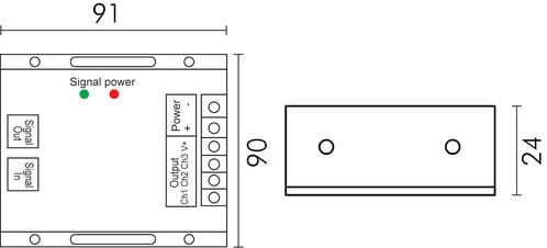 ** Caratteristiche ** Centralina di controllo per sorgenti luminose a led monocromatiche. L'apposito telecomando RF consente il controllo dell'intensità luminosa oltre che il controllo on/off. Inoltre il dispositivo mantiene memoria dell'ultimo modo di funzionamento impostato anche dopo aver spento e riacceso l'alimentazione. Più controller possono lavorare tra di loro simultaneamente se connessi tramite un cavo RJ45. ** Caratteristiche Generali ** Funzione: Controller Adatto per: Monocolore Metodo di controllo: RF ** Caratteristiche Elettriche ** Tipo regolazione: Tensione costante (CV) Tensione d'ingresso: 12/24V Tensione d'uscita: come ingresso Tipo di uscita: morsetti Metodo di connessione: anodo comune Corrente/Ch: 10A n. canali: 3 Potenza nominale (12V): 360W Potenza nominale (24V): 720W ** Caratteristiche Meccaniche ** Lunghezza: 91mm Larghezza: 90mm Altezza: 24mm Grado di protezione: IP20 Materiale corpo: Alluminio verniciato Colore corpo: Nero ** Caratteristiche Termiche ** Temp. di funzionamento: -10 / 40°C ** Note ** - I controller della serie Sync Tecnology sono ricevitori universali se non programmati. Questo significa che tutti i ricevitori sono controllabili da qualsiasi telecomando della stessa serie. Per sincronizzarli in modo ottimale possiamo sfruttare la tecnologia SyncTecnology collegando i ricevitori tramite un cavo Cat.5e o Cat.6 utilizzano le porte RJ45 presenti sul dispositivo. Il controller che decidiamo essere il principale dovrà essere collegato alla porta SignalOUT mentre i controller che decidiamo essere slave andranno connessi alla porta SignaIN. Una volta collegati in questo modo i controller slave si comportano da amplificatori e saranno perfettamente sincronizzati. E' possibile abbinare il controller-ricevitore a un telecomando tramite una procedura specifica e ti invitiamo a seguire il video dedicato per vedere come fare. - L'alimentatore dovrà essere scelto in funzione del tipo di carico led utilizzato per tensione e corrente. - Utilizzare un alimentatore con potenza nominale maggiore rispetto al carico led da alimentare (circa 30%).