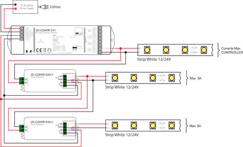 Ripetitore passivo di alimentazione adatto per estendere l'installazione di più sorgenti luminose a led monocromatiche. L'amplificatore consente di estendere l'utilizzo del controller monocromatico dimmer principale detto "Master" consentendo quindi di mantenere la sincronizzazione dell'intensità di luce comandata dal controller principale. ** Caratteristiche Generali ** Funzione: Amplificatore Adatto per: Monocolore ** Caratteristiche Elettriche ** Tipo regolazione: Tensione costante (CV) Tensione d'ingresso: 12/24/36V Tensione d'uscita: come ingresso Tipo di uscita: morsetti Corrente/Ch: 8A n. canali: 1 Potenza nominale (12V): 96W Potenza nominale (24V): 192W ** Caratteristiche Meccaniche ** Lunghezza: 95mm Larghezza: 37mm Altezza: 20mm Grado di protezione: IP20 Materiale corpo: Plastica Colore corpo: Bianco ** Caratteristiche Termiche ** Temp. di funzionamento: -10 / 40°C ** Note ** L'alimentatore dovrà essere scelto in funzione del tipo di carico led utilizzato per tensione e corrente. Utilizzare un alimentatore con potenza nominale maggiore rispetto al carico led da alimentare (circa 30%).