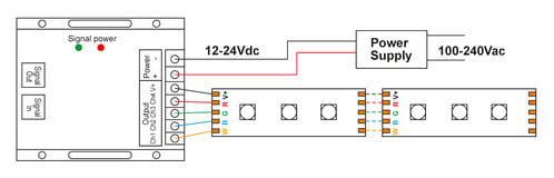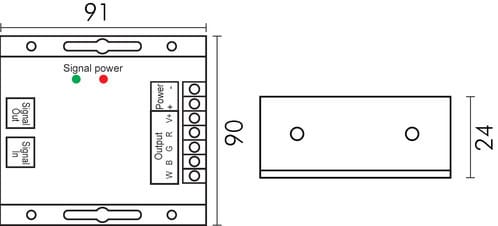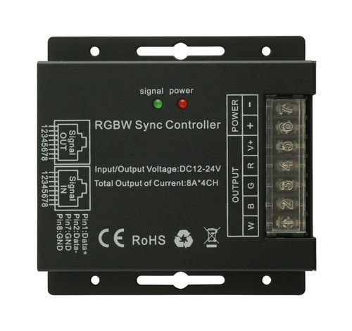 ** Caratteristiche ** Centralina di controllo per sorgenti luminose a led RGBW. L'apposito telecomando RF consente il controllo del colore della luce risultante, l'intensità luminosa e il controllo on/off. Inoltre il dispositivo mantiene memoria dell'ultimo modo di funzionamento impostato anche dopo aver spento e riacceso l'alimentazione. Più controller possono lavorare tra di loro simultaneamente se connessi tramite un cavo RJ45. ** Caratteristiche Generali ** Funzione: Controller Adatto per: RGBW Metodo di controllo: RF ** Caratteristiche Elettriche ** Tipo regolazione: Tensione costante (CV) Tensione d'ingresso: 12/24V Tensione d'uscita: come ingresso Tipo di uscita: morsetti Metodo di connessione: anodo comune Corrente/Ch: 8A n. canali: 4 Potenza nominale (12V): 384W Potenza nominale (24V): 768W ** Caratteristiche Meccaniche ** Lunghezza: 91mm Larghezza: 90mm Altezza: 24mm Grado di protezione: IP20 Materiale corpo: Alluminio verniciato Colore corpo: Nero ** Caratteristiche Termiche ** Temp. di funzionamento: -10 / 40°C ** Note ** - I controller della serie Sync Tecnology sono ricevitori universali se non programmati. Questo significa che tutti i ricevitori sono controllabili da qualsiasi telecomando della stessa serie. Per sincronizzarli in modoottimale possiamo sfruttare la tecnologia SyncTecnology collegando i ricevitori tramite un cavo Cat.5e o Cat.6 utilizzano le porte RJ45 presenti sul dispositivo. Il controller che decidiamo essere il principale dovrà essere collegato alla porta SignalOUTmentre i controller che decidiamo essere slave andranno connessi alla porta SignaIN. Una volta collegati in questo modo i controller slave si comportano da amplificatori e saranno perfettamente sincronizzati. E' possibile abbinare il controller-ricevitore a un telecomando tramite una procedura specifica e ti invitiamo a seguire il video dedicato per vedere come fare. - L'alimentatore dovrà essere scelto in funzione del tipo di carico led utilizzato per tensione e corrente. - Utilizzare un alimentatore con potenza nominale maggiore rispetto al carico led da alimentare (circa 30%).
