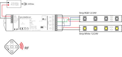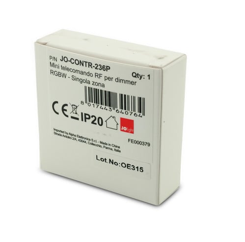 Telecomando per controllo colore di strisce LED RGBW. Il telecomando JO-CONTR-236P, utilizzato con gli appositi ricevitori di Alpha Elettronica opportunamente connessi ad una striscia led RGBW oppure ad una striscia led RGB ed una bianca, consente tramite il tasto “RGB” la miscelazione dei vari colori RGB e del bianco tramite il tasto “W”. Inoltre è possibile regolare l’intensità (dimmer) della luce alla colorazione scelta tramite i tasti funzione. ** Caratteristiche Tecniche Telecomando ** Frequenza: 868MHz Alimentazione: 3V Batterie: CR2430 Raggio d'azione: 30m Funzioni: Regolazione RGBW e dimmer Zone: 1 ** Caratteristiche Generali ** Funzione: Telecomando Adatto per: RGBW Metodo di controllo: RF ** Caratteristiche Meccaniche ** Lunghezza: 55mm Larghezza: 55mm Altezza: 11mm Grado di protezione: IP20 Materiale corpo: Plastica Colore corpo: Bianco ** Note ** Il telecomando deve essere utilizzato in abbinamento con almeno un ricevitore apposito di Alpha Elettronica ** (non incluso) ** . Un telecomandoJO-CONTR-236P può lavorare con tanti ricevitori (fino a 100 a patto che tutti i dispositivi coinvolti siano all’interno del raggio di 30m). Un ricevitore può lavorare con più telecomandi (fino a 6). Al momento dell'installazione i telecomandi devono essere associati ai relativi ricevitori tramite il tasto “Learning key” presente sul ricevitore.