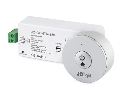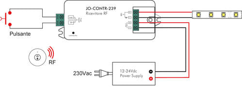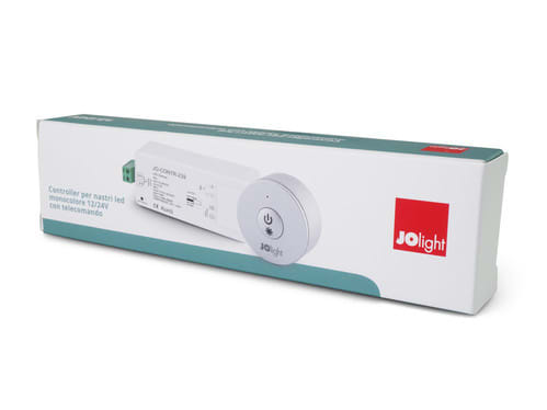 Kit dimmer per nastri led monocolore e telecomando RF. Questo controller funziona da ricevitore per opportuni telecomandi a radio frequenza attraverso i quali è possibile comandare l'intensità di colore. Il dispositivo JO-CONTR-239 mantiene memoria dell'ultimo modo di funzionamento impostato anche dopo aver spento e riacceso l'alimentazione. ** Caratteristiche Tecniche Telecomando RF JO-CONTR-026P ** Metodo di controllo: telecomando RF Frequenza: 868MHz Batterie: 3V 1 x CR2025 Raggio d'azione: 20m Funzioni: Dimmer Dimensioni: ø38.5x14.8mm ** Caratteristiche Generali ** Funzione: Controller Adatto per: Monocolore Metodo di controllo: RF ** Caratteristiche Elettriche ** Tipo regolazione: Tensione costante (CV) Tensione d'ingresso: 12/24/36/48V Tensione d'uscita: come ingresso Tipo di uscita: morsetti Corrente/Ch: 8A n. canali: 1 Potenza nominale (12V): 96W Potenza nominale (24V): 192W Potenza nominale (48V): 288W ** Caratteristiche Meccaniche ** Lunghezza: 95mm Larghezza: 37mm Altezza: 20mm Grado di protezione: IP20 Materiale corpo: Plastica Colore corpo: Bianco ** Caratteristiche Termiche ** Temp. di funzionamento: -10 / 40°C Un ricevitore JO-CONTR-239 può lavorare con più telecomandi (fino a 6) dello stesso tipo. Un telecomando può lavorare con tanti ricevitori (fino a 100 per ogni zona a patto che tutti i dispositivi coinvolti siamo all’interno del raggio di 20m). Nel caso di installazioni con più di un ricevitore all'interno di una singola zona, occorre impostare il primo ricevitore come MASTERe i successivi come SLAVE. Al momento dell'installazione i telecomandi devono essere associati a tutti i relativi ricevitori tramite il tasto “Learning key” presente sul ricevitore. L'alimentatore dovrà essere scelto in funzione del tipo di carico led utilizzato per tensione e corrente. Utilizzare un alimentatore con potenza nominale maggiore rispetto al carico led da alimentare (circa 30%).