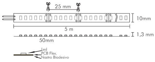 ** Caratteristiche Generali ** Applicazione: Per illuminazione Tempo di vita L70B50: 20000h Numero cicli di accensione: 10000 cicli Tipo nastro: Monocolore Colore Supporto: Bianco Tipo di led: smd 2835 0.5W n. Led al metro: 240 led/m Lunghezza max in cascata: 5m Rischio fotobiologico: Esente ** Caratteristiche di Illuminazione ** Colore: Bianco caldo Flusso Nastro Led: 2400lm/m CRI: 94 Angolo di emissione: 120° ** Caratteristiche Elettriche ** Potenza Nastro Led: 30W/m Potenza unità minima: 0.75W Tens.funzionamento DC: 24Vdc Dimmerabile: si Alimentatore: Esterno (non incluso) ** Caratteristiche Sorgente Luminosa ** Temp. Colore: 2700K ** Caratteristiche Meccaniche ** Lunghezza nastro: 5m N. Led/taglio: 6 Lunghezza taglio minima: 25mm Larghezza: 10mm Spessore: 1.3mm Fissaggio: Biadesivo 3M Grado di protezione: IP20 Tipo di protezione: Nessuno Connessioni: Cavo libero ** Caratteristiche Termiche ** Temp. di funzionamento: -10 / 40°C