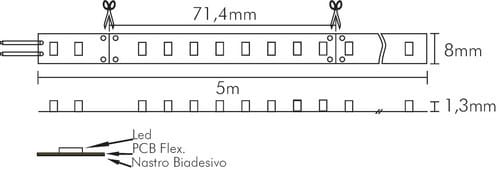 ** Caratteristiche Generali ** Applicazione: Per illuminazione Tempo di vita L70B50: 20000h Numero cicli di accensione: 10000 cicli Fattore di sopravvivenza: 0.9 Tipo nastro: Monocolore Colore Supporto: Bianco Tipo di led: smd 2835 0.2W n. Led al metro: 112 led/m Lunghezza max in cascata: 5m Rischio fotobiologico: Esente ** Caratteristiche di Illuminazione ** Colore: Bianco caldo Flusso Nastro Led: 1015lm/m Flusso @ 50cm: 507lm CRI: 90 Angolo di emissione: 120° Warm-up (60%): 0.1s Fattore mantenimento flusso: 0.96 Uniformità colore (SDCM): 6 ** Caratteristiche Elettriche ** Classe energetica: F Potenza Nastro Led: 9.6W/m Potenza 50cm: 4.8W Potenza unità minima: 0.68544W Tens. funzionamento DC: 24Vdc Dimmerabile: si Alimentatore: Esterno (non incluso) ** Caratteristiche Sorgente Luminosa ** Temp. Colore: 3000K ** Caratteristiche Meccaniche ** Lunghezza nastro: 5m N. Led/taglio: 8 Lunghezza taglio minima: 71.4mm Larghezza: 5000mm Spessore: 1.3mm Altezza: 8mm Fissaggio: Biadesivo 3M Grado di protezione:IP20 Tipo di protezione: Nessuno Connessioni: Cavo libero ** Caratteristiche Termiche ** Temp. di funzionamento: -10 / 40°C