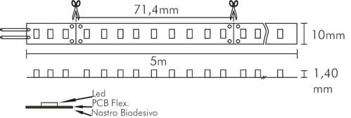 ** Caratteristiche Generali ** Applicazione: Per illuminazione Tempo di vita L70B50: 20000h Numero cicli di accensione: 10000 cicli Tipo nastro: Monocolore Colore Supporto: Bianco Tipo di led: smd 5630 n. Led al metro: 126 led/m Lunghezza max in cascata:5m Rischio fotobiologico: Esente ** Caratteristiche di Illuminazione ** Colore: Bianco naturale Flusso Nastro Led: 2760lm/m CRI: 80 Angolo di emissione: 120° Warm-up (60%): 0.1s ** Caratteristiche Elettriche ** Potenza Nastro Led: 14.4W/m Potenza unitàminima: 1.02816W Tens. funzionamento DC: 24Vdc Dimmerabile: si Alimentatore: Esterno (non incluso) ** Caratteristiche Sorgente Luminosa ** Temp. Colore: 4000K ** Caratteristiche Meccaniche ** Lunghezza nastro: 5m N. Led/taglio: 9 Lunghezza taglio minima: 71.4mm Larghezza: 10mm Spessore: 1.4mm Fissaggio: Biadesivo 3M Grado di protezione: IP20 Tipo di protezione: Nessuno Connessioni: Cavo libero ** Caratteristiche Termiche ** Temp. di funzionamento: -10 / 40°C