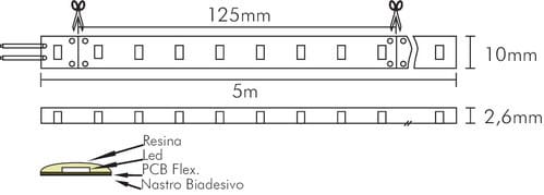 ** Caratteristiche Generali ** Applicazione: Per illuminazione Tempo di vita L70B50: 20000h Numero cicli di accensione: 10000 cicli Fattore di sopravvivenza: 0.9 Tipo nastro: Monocolore Colore Supporto: Bianco Tipo di led: smd 2835 0.5W n. Led al metro: 64 led/m Lunghezza max in cascata: 5m Rischio fotobiologico: Esente ** Caratteristiche di Illuminazione ** Colore: Bianco naturale Flusso Nastro Led: 1240lm/m Flusso @ 50cm: 620lm CRI: 94 Angolo di emissione: 120° Warm-up (60%): 0.1s Fattore mantenimentoflusso: 0.96 Uniformità colore (SDCM): 6 ** Caratteristiche Elettriche ** Classe energetica: F Potenza Nastro Led: 12W/m Potenza 50cm: 6W Potenza unità minima: 1.5W Tens. funzionamento DC: 24Vdc Dimmerabile: si Alimentatore: Esterno (non incluso) ** Caratteristiche Sorgente Luminosa ** Temp. Colore: 4000K ** Caratteristiche Meccaniche ** Lunghezza nastro: 5m N. Led/taglio: 8 Lunghezza taglio minima: 125mm Larghezza: 10mm Spessore: 2.6mm Altezza: 2mm Fissaggio: Biadesivo 3M Grado di protezione: IP65 Tipo di protezione: Resina Connessioni: Cavo libero ** Caratteristiche Termiche ** Temp. di funzionamento: -10 / 40°C
