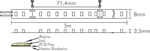 ** Caratteristiche Generali ** Applicazione: Per illuminazione Tempo di vita L70B50: 20000h Numero cicli di accensione: 10000 cicli Fattore di sopravvivenza: 0.9 Tipo nastro: Monocolore Colore Supporto: Bianco Tipo di led: smd 2835 0.2W n. Led al metro: 112 led/m Lunghezza max in cascata: 5m Rischio fotobiologico: Esente ** Caratteristiche di Illuminazione ** Colore: Bianco caldo Flusso Nastro Led: 1530lm/m Flusso @ 50cm: 764lm CRI: 90 Angolo di emissione: 120° Warm-up (60%): 0.1s Fattore mantenimento flusso: 0.96 Uniformità colore (SDCM): 6 ** Caratteristiche Elettriche ** Classe energetica: F Potenza Nastro Led: 14.4W/m Potenza 50cm: 7.2W Potenza unità minima: 1.02816W Tens. funzionamento DC: 24Vdc Dimmerabile: si Alimentatore: Esterno (non incluso) ** Caratteristiche Sorgente Luminosa ** Temp. Colore: 3000K ** Caratteristiche Meccaniche ** Lunghezza nastro: 5m N. Led/taglio: 8 Lunghezza taglio minima: 71.4mm Larghezza: 5000mm Spessore: 3.5mm Altezza: 8mm Fissaggio: Biadesivo 3M Grado di protezione: IP65 Tipo di protezione: Resina Connessioni: Cavo libero ** Caratteristiche Termiche ** Temp. di funzionamento: -10 / 40°C