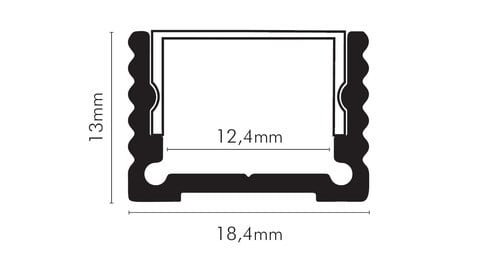 ** Caratteristiche generali ** Kit composto da: -n. 1 profilo di alluminio da 2m, -n. 1 copertura da 2m -n. 2 terminali di chiusura in plastica -n. 4 graffette di fissaggio ** Caratteristiche Elettriche ** Potenza dissipabile (35°C): 19W/m ** Caratteristiche Meccaniche ** Lunghezza profilo: 2m Larghezza: 18.4mm Larghezza interna: 12.4mm Altezza: 13mm Grado di protezione: IP20 Materiale corpo: Alluminio verniciato Colore corpo: Nero Diffusore: PMMA nero ** Attenzione ** La copertura in PMMA è più resistente alle temperature e ai raggi UV rispetto alla copertura in Policarbonato (PC). Il profilo illustrato è un componente. Il suo corretto funzionamento con nastri led o moduli led dipende da importanti requisiti di installazione e dimensionamento. La potenza dissipabile è stata calcolata considerando una temperatura ambiente non superiore a 35°C in aria. Condizioni di installazione differenti devono essere opportunamente verificate da personale tecnico. Utilizzare la copertura solo con nastri led IP20. Alpha Elettronica declina ogni responsabilità per danni o malfunzionamenti derivati da un uso inappropriato del profilo.