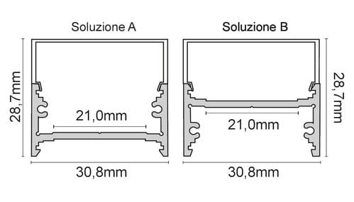 ** Caratteristiche generali ** Composto da: -n. 1 profilo di alluminio da 2m, -n. 1 copertura da 2m ** Caratteristiche Elettriche ** Potenza dissipabile (35°C): 30W/m ** Caratteristiche Meccaniche ** Lunghezza profilo: 2m Larghezza: 30.8mm Larghezza interna: 21mm Altezza: 28.7mm Grado di protezione: IP20 Materiale corpo: Alluminio Colore corpo: Naturale Diffusore: PMMA opaco ** Attenzione ** La copertura in PMMA è più resistente alle temperature e ai raggi UV rispetto alla copertura in Policarbonato (PC). Il profilo illustrato è un componente. Il suo corretto funzionamento con nastri led o moduli led dipende da importanti requisiti di installazione e dimensionamento. La potenza dissipabile è stata calcolata considerando una temperatura ambiente non superiore a 35°C in aria. Condizioni di installazione differenti devono essere opportunamente verificate da personale tecnico. Utilizzare la copertura solo con nastri led IP20. Alpha Elettronica declina ogni responsabilità per danni o malfunzionamenti derivati da un uso inappropriato del profilo.