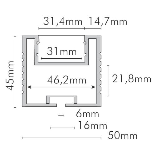 ** Caratteristiche generali ** Composto da: -n. 1 profilo di alluminio da 2m, -n. 1 copertura da 2m ** Caratteristiche Elettriche ** Potenza dissipabile (35°C): 32W/m ** Caratteristiche Meccaniche ** Lunghezza profilo: 2m Larghezza: 50mm Larghezza interna: 31mm Altezza: 45mm Grado di protezione: IP20 Materiale corpo: Alluminio Colore corpo: Naturale Diffusore: Policarbonato opaco ** Attenzione ** La copertura in Policarbonato (PC) è più sensibile alle temperature e ai raggi UV rispetto alla coperturain PMMA. Il profilo illustrato è un componente. Il suo corretto funzionamento con nastri led o moduli led dipende da importanti requisiti di installazione e dimensionamento. La potenza dissipabile è stata calcolata considerando una temperatura ambiente non superiore a 35°C in aria. Condizioni di installazione differenti devono essere opportunamente verificate da personale tecnico. Utilizzare la copertura solo con nastri led IP20. Alpha Elettronica declina ogni responsabilità per danni o malfunzionamentiderivati da un uso inappropriato del profilo. Il profilo illustrato non é compatibile con dimmer metal touch JO-CONTR-014. Il montaggio della copertura plastica deve essere effettuata a scorrimento.